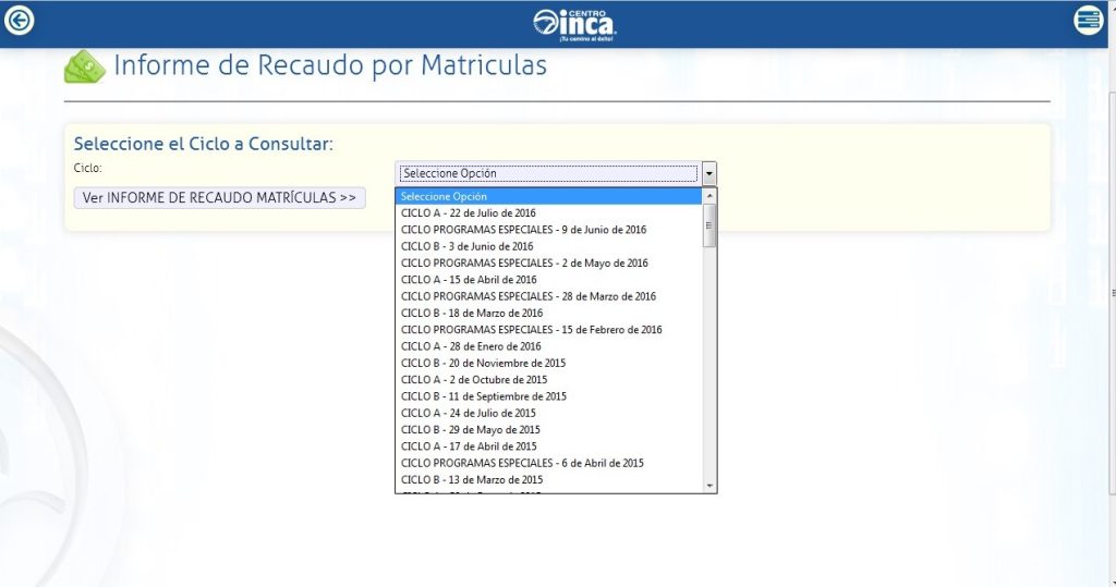 Imagen 1. Selección del ciclo a consultar y clic a ver informe de recaudo de matrícula.