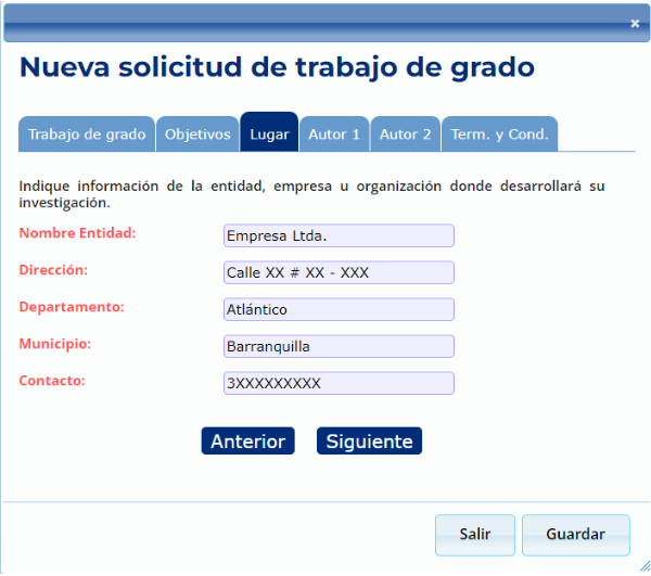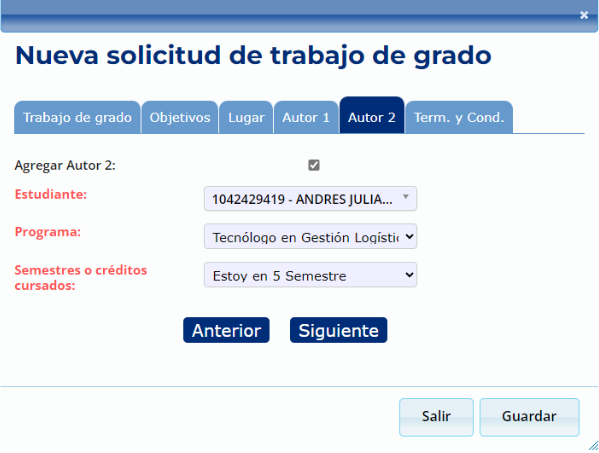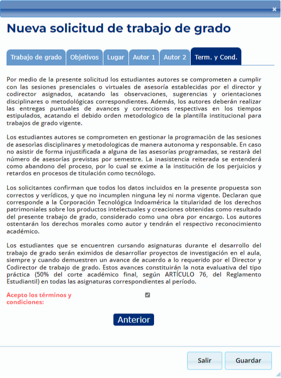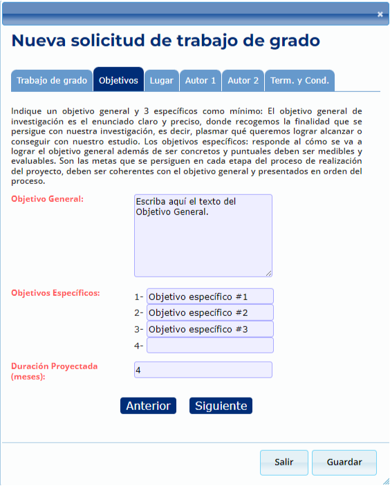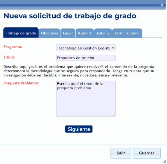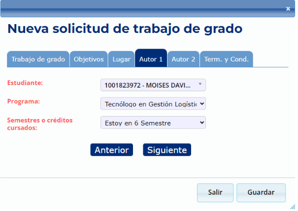 Para solicitar un nuevo Trabajo de Grado da click en el botón Solicitar nuevo trabajo de grado. Llene el formulario pasando por cada una de las pestañas o usando los botones de Anterior o Siguiente que se encuentra en la parte inferior de cada sección del formulario: