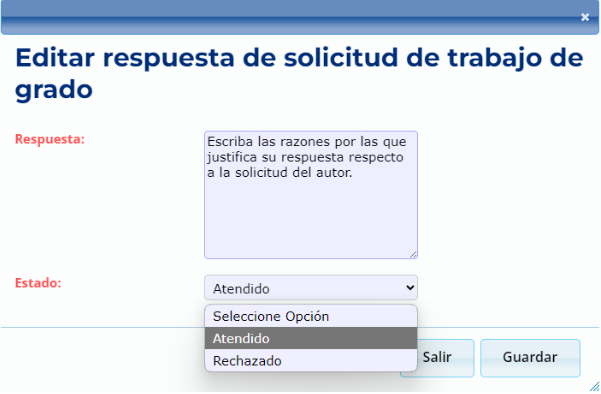 Llene el formulario, escribiendo su respuesta, además del estado de la solicitud y de clic en Guardar:
