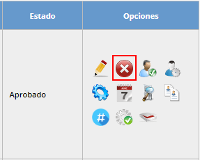 En caso de que se apruebe un desistimiento grupal o desiste el único Autor de la propuesta, se debe proceder a una cancelación del mismo, para realizarlo de click en el siguiente ícono: